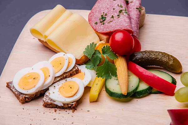 Lecker, bunt & voller Energie! Mit belegten Brötchen, Vollkornbrot, frischem Obst, eigenen Aufstrichen und mildem Müsli starten die Kinder gut gestärkt in den Tag.